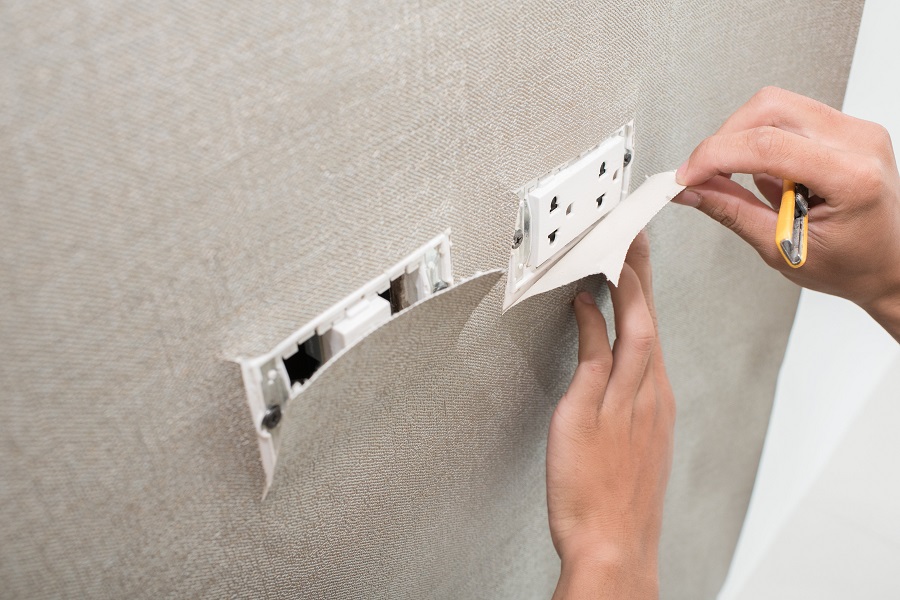 Pasting wallpaper around electric sockets and switches can be quite dangerous, especially if the walls are damp. As a general rule of thumb, we recommend you switch off the electricity. Then, with the help of an electrician, run a voltage test to make sure there is no more electricity passing through the power line.